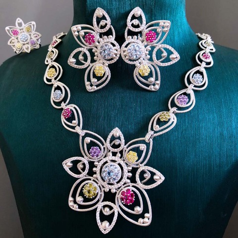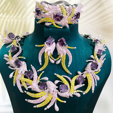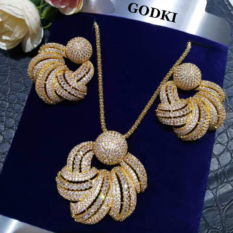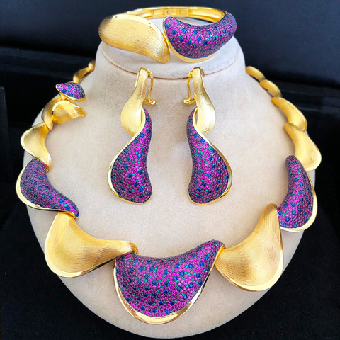T274 özel lüks Dubai gelin düğün akşam parti seti kadınlar için çok kübik zirkon ilmek kolye küpe altın bakır